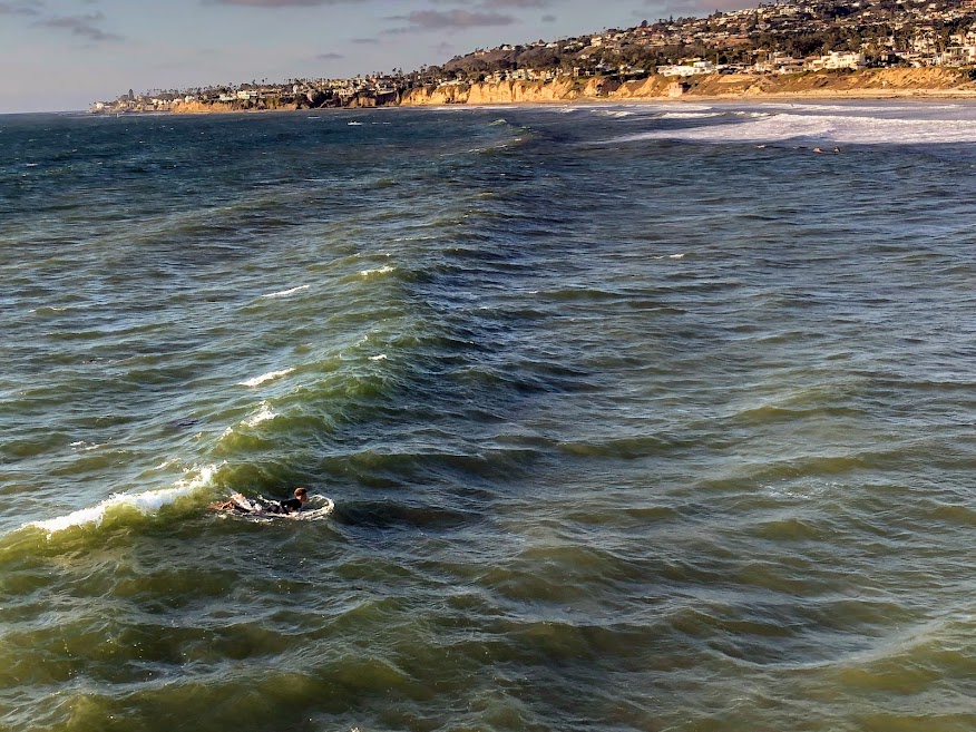Here we are looking out over North Pacific Beach from the Crystal Pier. If you follow the surf break straight ahead, this is where the Tourmaline Surfing Park is located (just south of Law Street Beach.) When the conditions are right, you will see many surfers paddling out past False Point (see map above.)